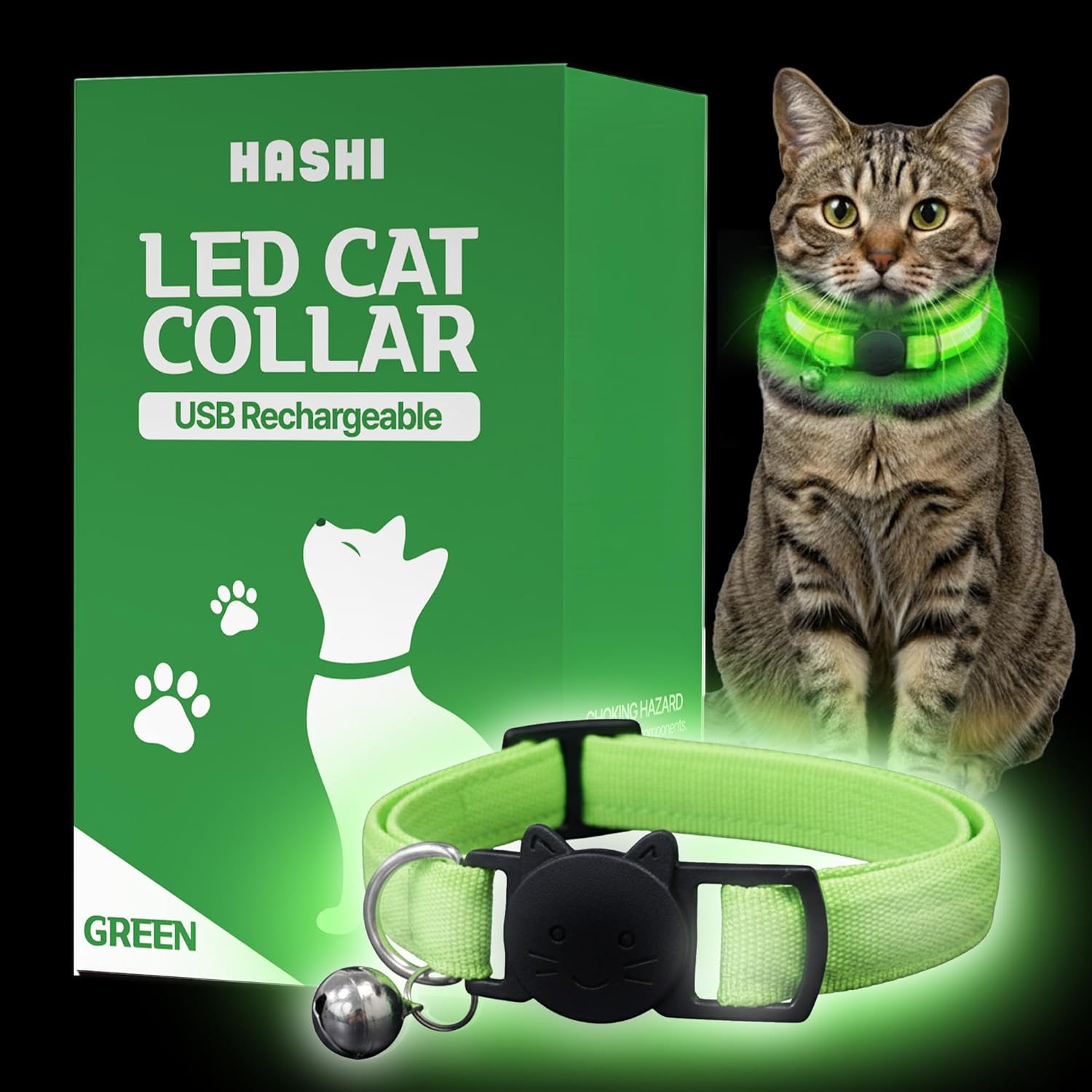 HA SHI LED Cat Collar with Bell – USB Rechargeable, 3 Flashing Modes, Breakaway Safety Buckle, Lightweight Glow-in-Dark Collar Fits Kittens & Adult Cats (Green)