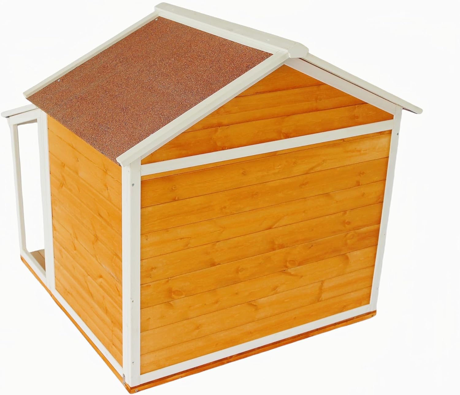Weatherproof Design: This wooden dog house is built to withstand outdoor elements, featuring an asphalt roof and plastic door curtain.